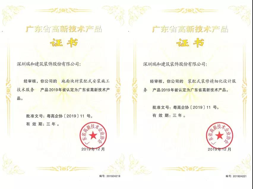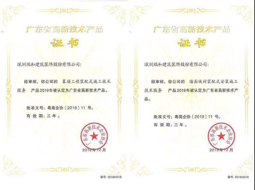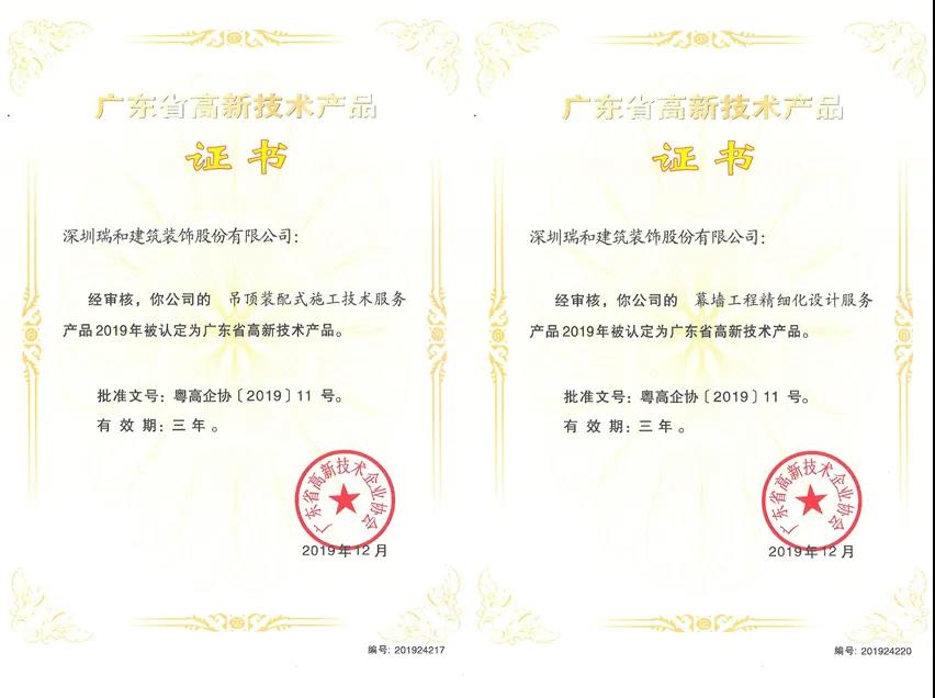 近日,廣東省高新技術企業協會公示了2019年高新技術產品名單,深圳瑞和建筑裝飾股份有限公司(以下稱“瑞和股份”)斬獲六項高新技術產品認定證書:《裝配式裝修精細化設計服務》、《幕墻工程精細化設計服務》、《吊頂裝配式施工技術服務》、《地面塊材裝配式安裝施工技術服務》、《墻面塊材裝配式安裝施工技術服務》、《幕墻工程裝配式施工技術服務》。