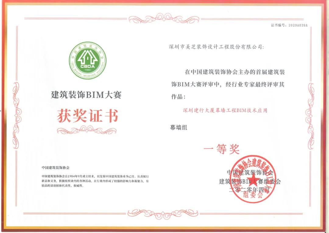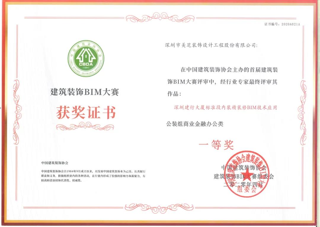 近日,中國建筑裝飾協會公布了2021年度“建筑裝飾行業科學技術獎”入選名單,美芝股份深圳建行大廈非公共區域精裝修設計施工一體化和幕墻工程榮獲“科技創新工程二等獎”;超高肌理復合銅板造型墻施工技術、不銹鋼金屬造型屏風施工技術2項技術榮獲“科技創新成果二等獎”。