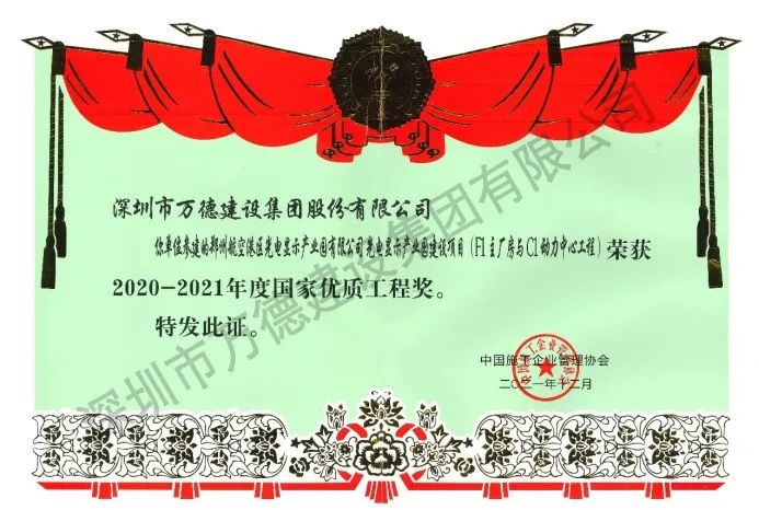 日前,萬德建設集團參建的鄭州航空港區光電顯示產業園建設項目(F1主廠房與C1動力中心工程)榮獲“2020-2021年度國家優質工程獎”。