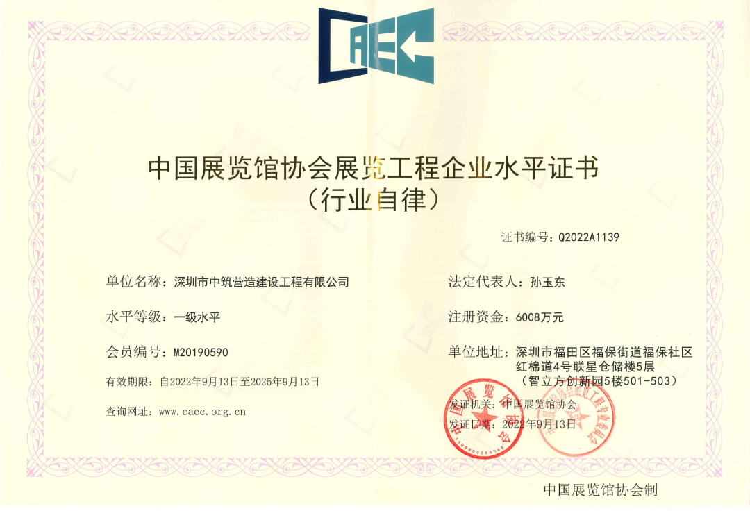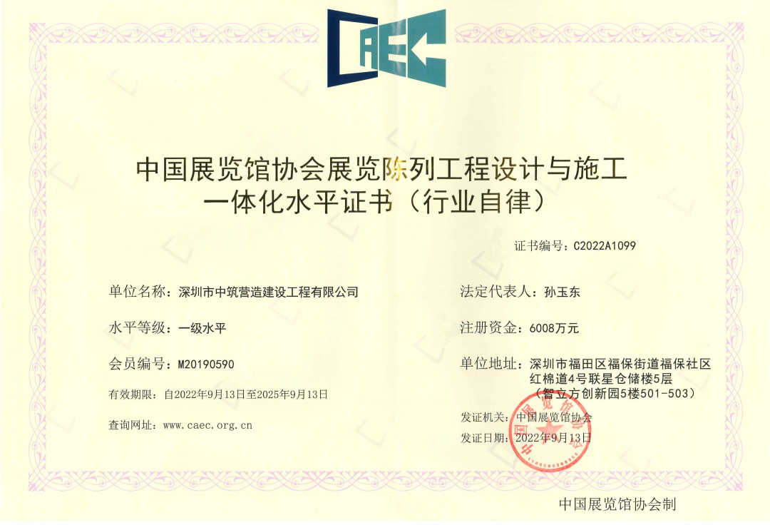 近日,深圳市中筑營造建設工程有限公司順利通過中國展覽館協會的資質等級復評,榮獲一級“中國展覽館協會展覽工程企業水平證書”和“中國展覽館協會展覽陳列工程設計與施工一體化水平證書”。