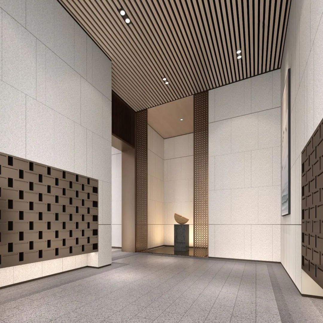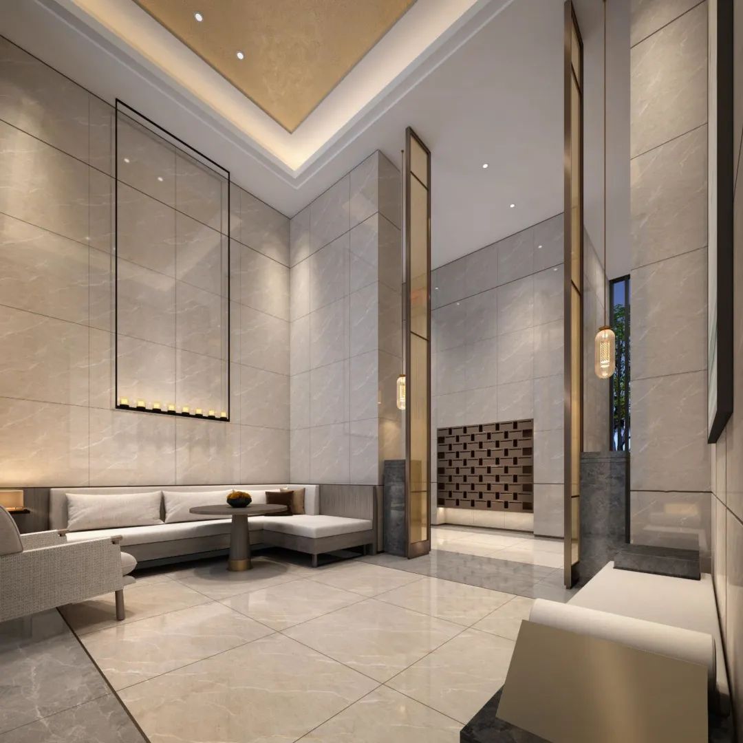 信達(dá)秦禾·金尊府項(xiàng)目設(shè)計(jì)范圍包含樣板間、首層入戶大堂以及架空層,其中入戶大堂采用半開放式設(shè)計(jì)和園林相輔相成,外展區(qū)設(shè)置信報(bào)箱、快遞柜等功能空間。考慮到業(yè)主短暫休憩的需求,設(shè)置了休息區(qū)、公告欄以及主題墻等區(qū)域,讓公共空間美觀實(shí)用且具有品質(zhì)感。
