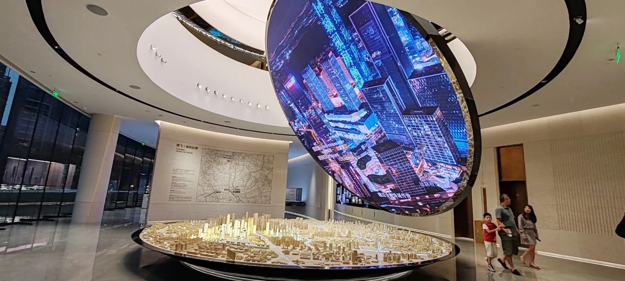 同時也設有精心設計的圖文展示墻,詳細記錄了長隆萬博片區的發展歷程和未來規劃,從萬博片區到項目自身,層層遞進,即使非廣州本地人也能迅速了解板塊情況。從一樓,可以清晰看到番禺的發展,看到萬博CBD從1.0到3.0的一路進化與迭代。從2006年萬博商務區概念面世,再到2013年控規獲批,直至2023年完成擴容。擴容后的萬博商務區,由1.5平方公里擴展至7.2平方公里,涵蓋漢溪長隆、萬博、里仁洞三大板塊,并統稱為“廣州南CBD”。360°沉浸式影廳,給大家描繪萬博未來城市的生活方式。