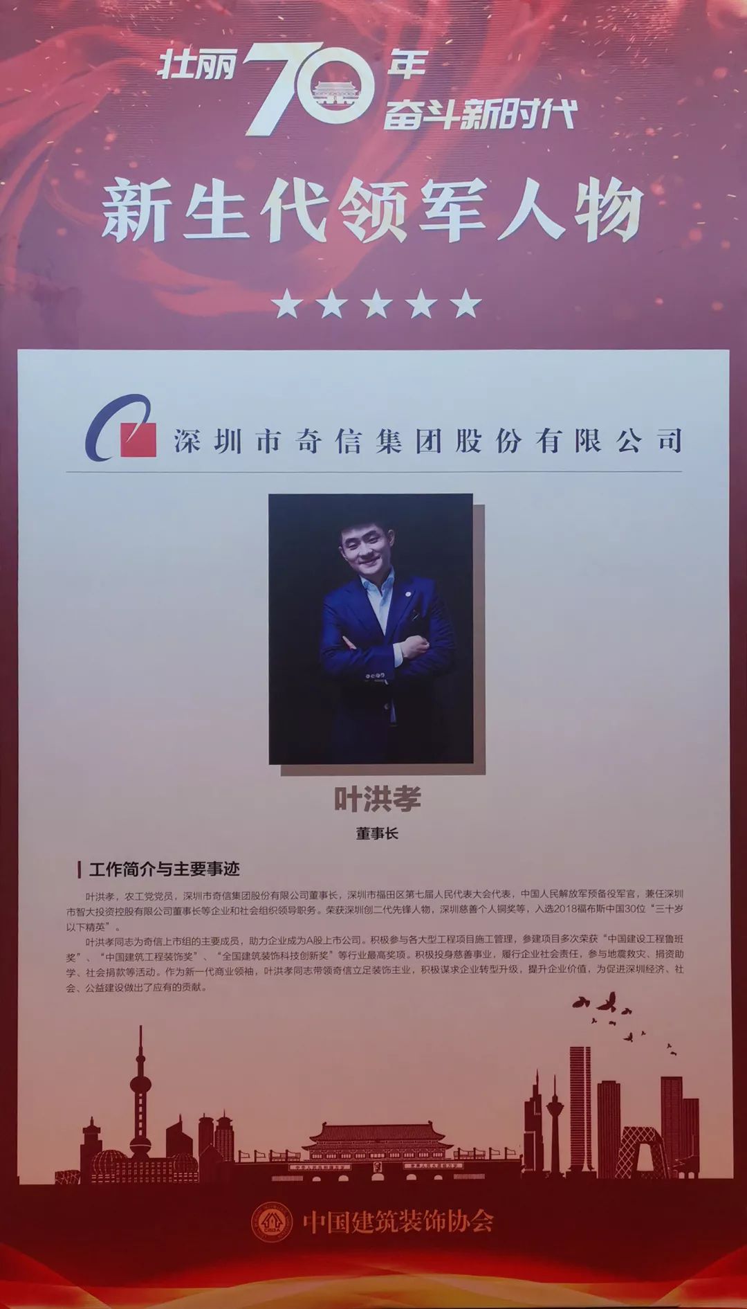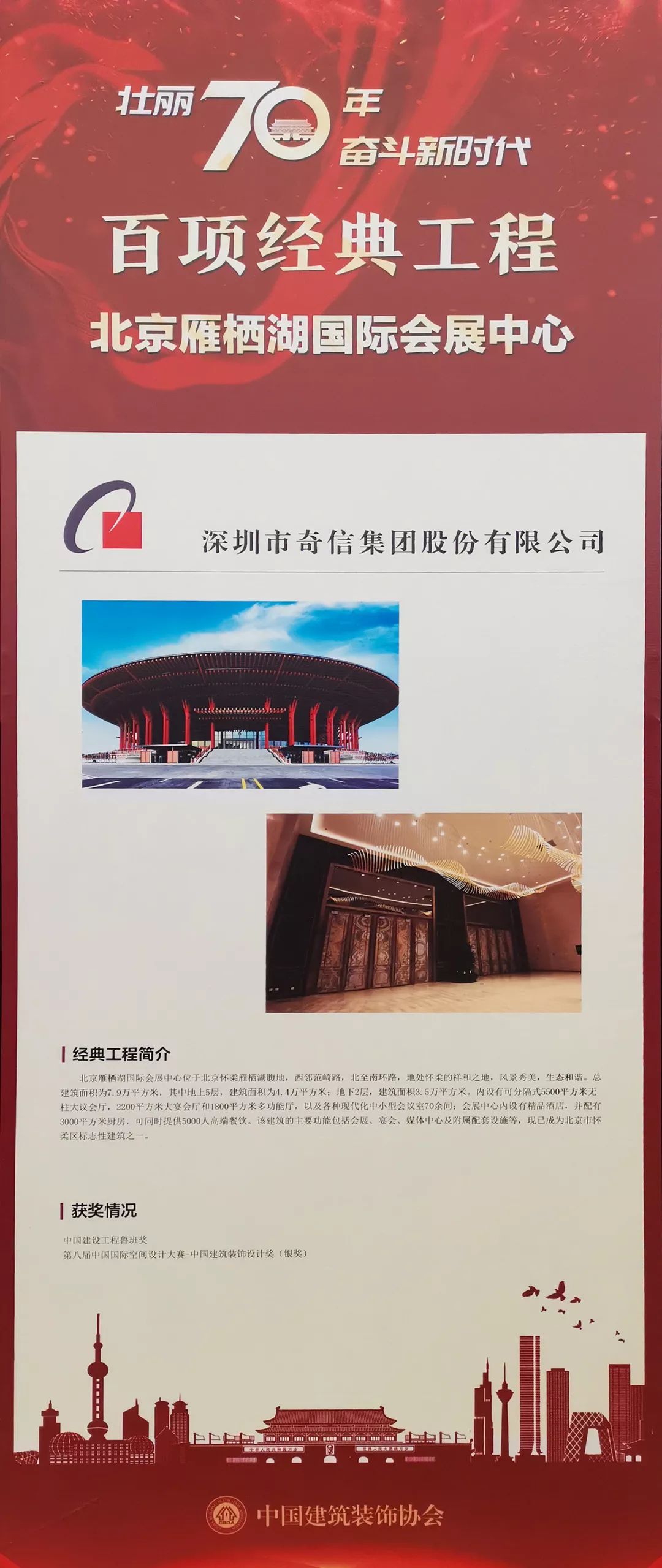 2019年11月28日-29日,第四屆全國建筑裝飾行業科技創新大會暨大國裝飾70年輝煌成就展在青島國際會議中心隆重召開。會上,深圳市奇信建設集團股份有限公司(以下稱“奇信股份”)被授予“科技創新企業”稱號,其承建的項目北京雁棲湖國際會展中心獲得“70周年百項經典工程”稱號,奇信股份董事長葉洪孝榮獲“新生代領軍人物“稱號。