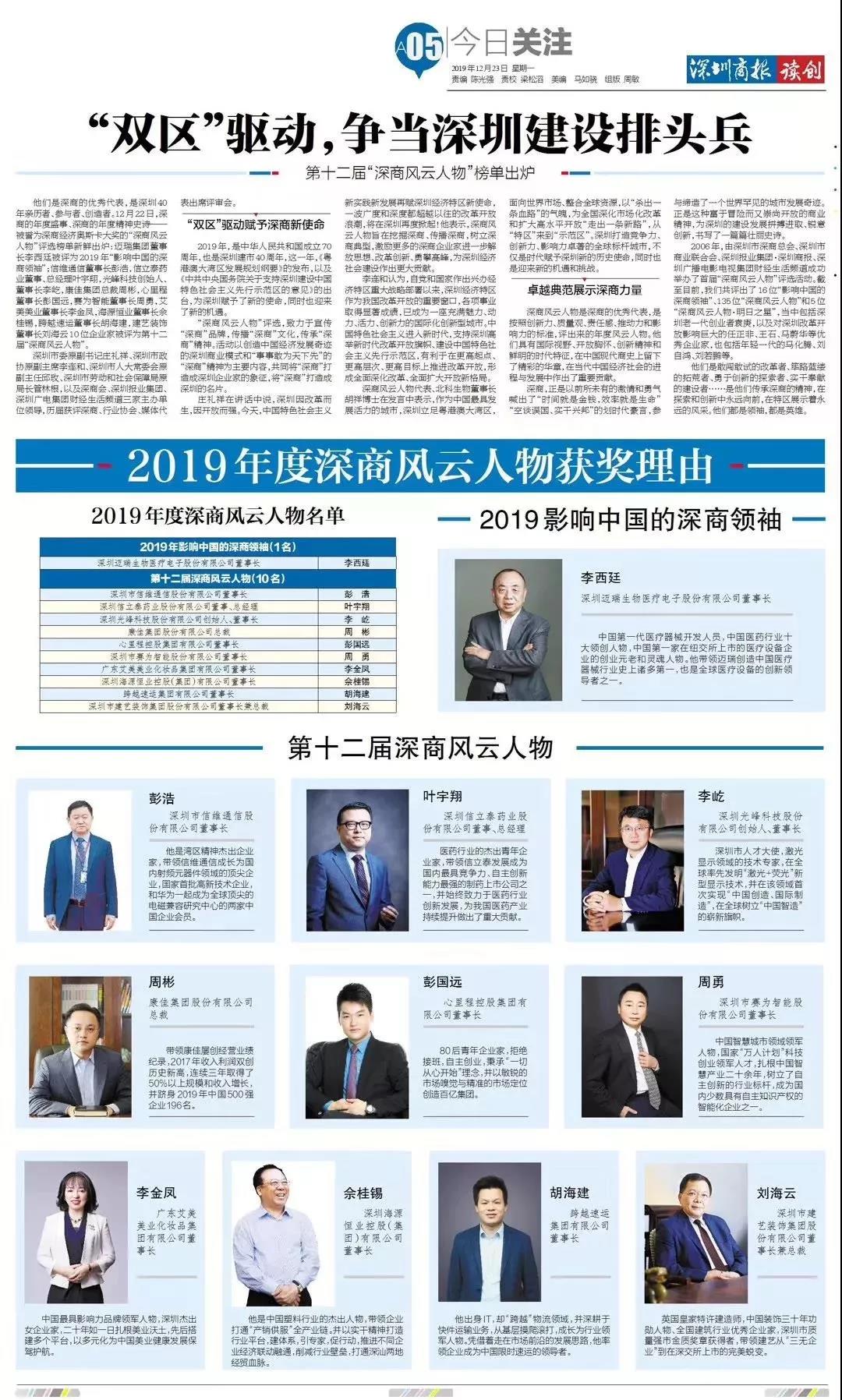 據悉,“深商風云人物”評選評選活動創辦于2006年,旨在宣傳“深商”品牌,傳播“深商”文化,傳承“深商”精神?;顒右詣撛熘袊洕l展奇跡的深圳商業模式和“事事敢為天下先”的“深商”精神為主要內容,共同將“深商”打造成深圳企業家的象征,將“深商”打造成深圳的名片。 按照創新力、質量觀、責任感、推動力和影響力的標準,最終有十位企業家通過評審,成功入選本屆“深商風云人物”榜單。