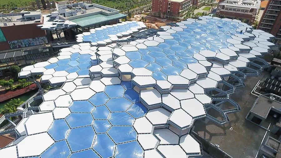 《超高大樹狀自膨脹ETFE天幕膜結(jié)構(gòu)施工工法》是通過研發(fā)并應(yīng)用“天幕膜夾膜水槽集成結(jié)構(gòu)技術(shù)”、“自膨脹ETFE天幕膜材技術(shù)”和“超高大樹狀鋼支撐桿技術(shù)”,結(jié)合BIM技術(shù)模擬施工現(xiàn)場,達(dá)到精準(zhǔn)生產(chǎn)加工、精準(zhǔn)施工安裝的科技成果。此工法可在不增加成本、保證膜結(jié)構(gòu)工程質(zhì)量的情況下,有效地縮短工期、節(jié)能減耗、優(yōu)化工藝流程和施工技術(shù),提高ETFE天幕膜結(jié)構(gòu)安裝的施工效率,解決施工中的碰撞沖突問題。