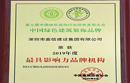 嘉信建設集團:榮獲中國綠色建筑裝飾“2019年度最具影響力品牌機構”稱號