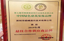 皓峰通訊:榮獲中國綠色建筑裝飾品牌2019年度“最佳合作供應商品牌” 稱號