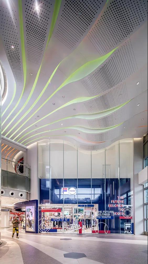 同時(shí)通過(guò)簡(jiǎn)單的改變天花LED燈光的顏色,就能夠改變整個(gè)入口的氛圍,為商場(chǎng)帶來(lái)更多的未來(lái)感和時(shí)尚氣息。