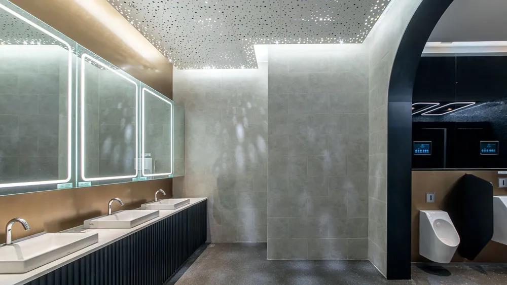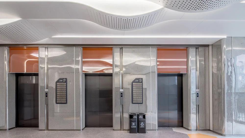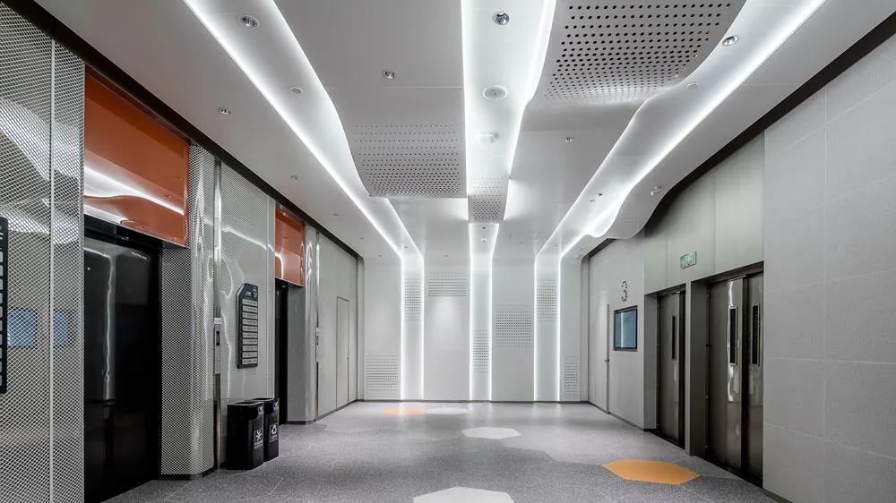 在次要空間中,衛(wèi)生間和電梯廳都延續(xù)了生長(zhǎng)的概念,通過(guò)現(xiàn)代時(shí)尚的弧形邊角處理,形成一種微妙的科技感,局部點(diǎn)綴的色彩,使空間增加了年輕的氛圍。