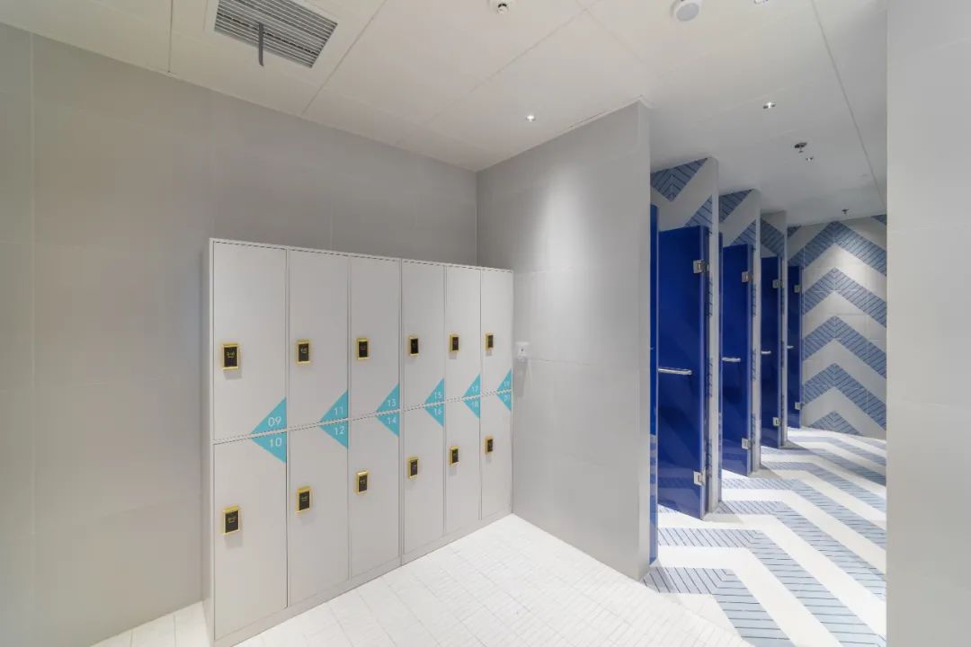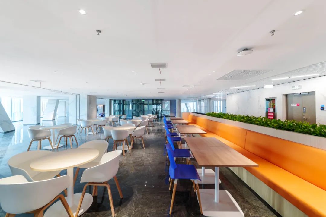 走進A棟6層中庭連廊,首先步入眼簾的是高達12米的中庭連廊,頂部采用防曬膜,地面采用不同顏色人造石進行鋪裝,光亮大氣油然而生;墻面再搭配白色和木紋轉印鋁板的裝飾,整體風格簡約大氣。