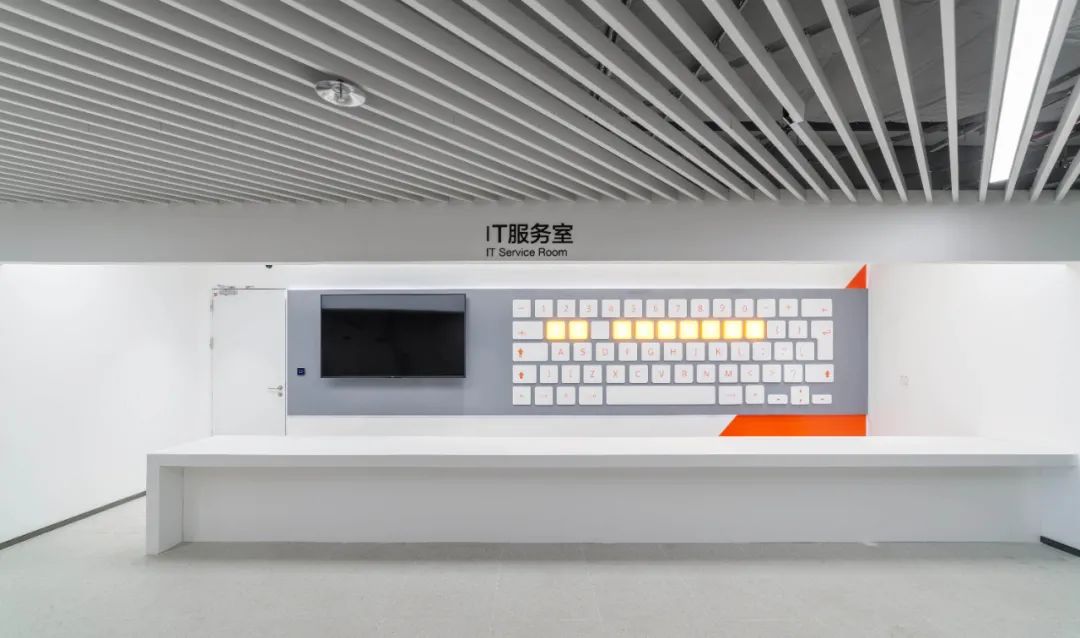 天花采用鋁方通格柵吊頂和開放式原頂噴涂,增加了平面導向性,提升了天花空間,降低了多種裝飾材料堆積造成的空氣污染,營造綠色環保的辦公環境。