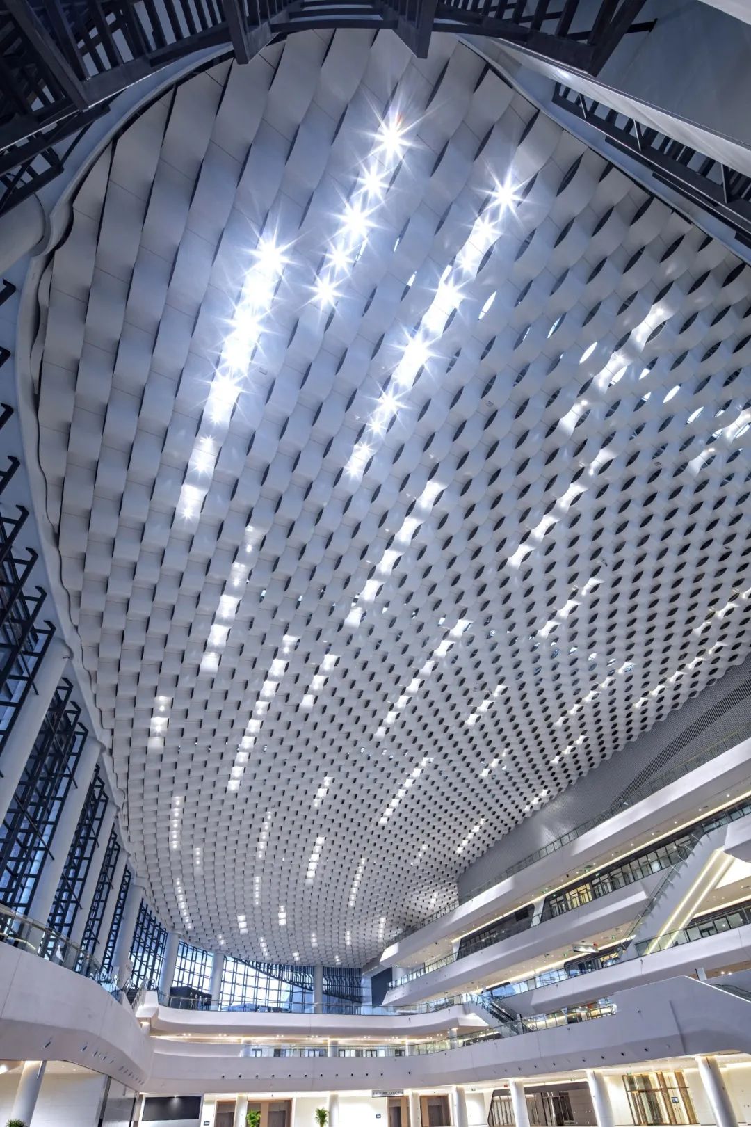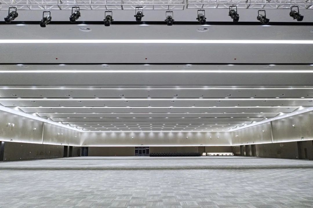 走進門廳,一股簡潔明快、清新大方的現代之風撲面而來。站在高大寬闊的大廳前,人顯得如此渺小。放眼望去,無論是那充滿海浪流動感的四層樓裙,還是那連綿起伏、波瀾涌動的波浪形吊頂,亦或是那鑲嵌在波浪之中宛如明珠般的點點燈光,都讓人有一種身臨浩瀚大海之感。主登錄廳也是整個會展中心最具特色、最核心、最重要的區域之一。