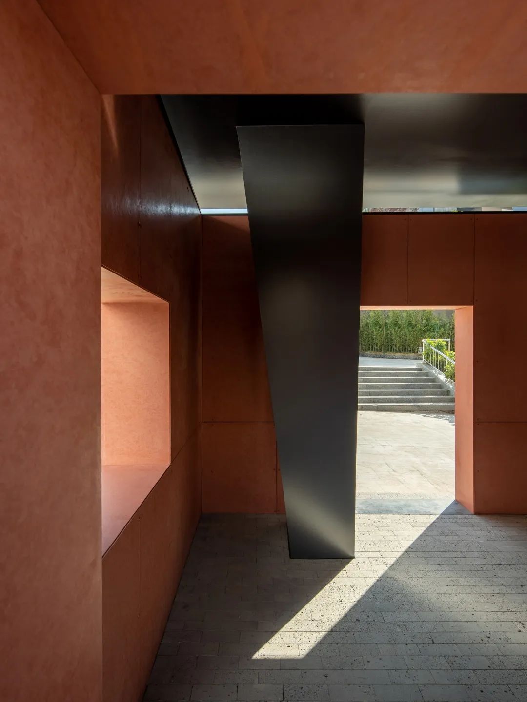 主場館的外立面改造延續了紅與黑相互嵌套的敘述,呼應廠房原有的坡形山墻屋頂與不遠處的群山,形成了一座抽象線條構成的幾何山丘。