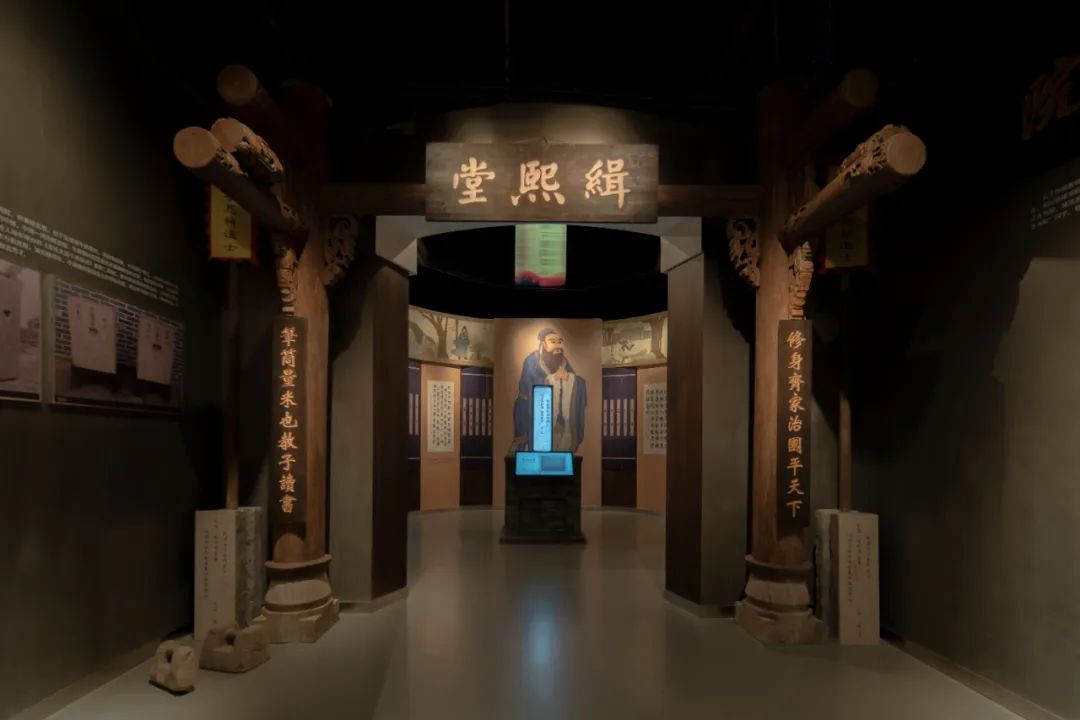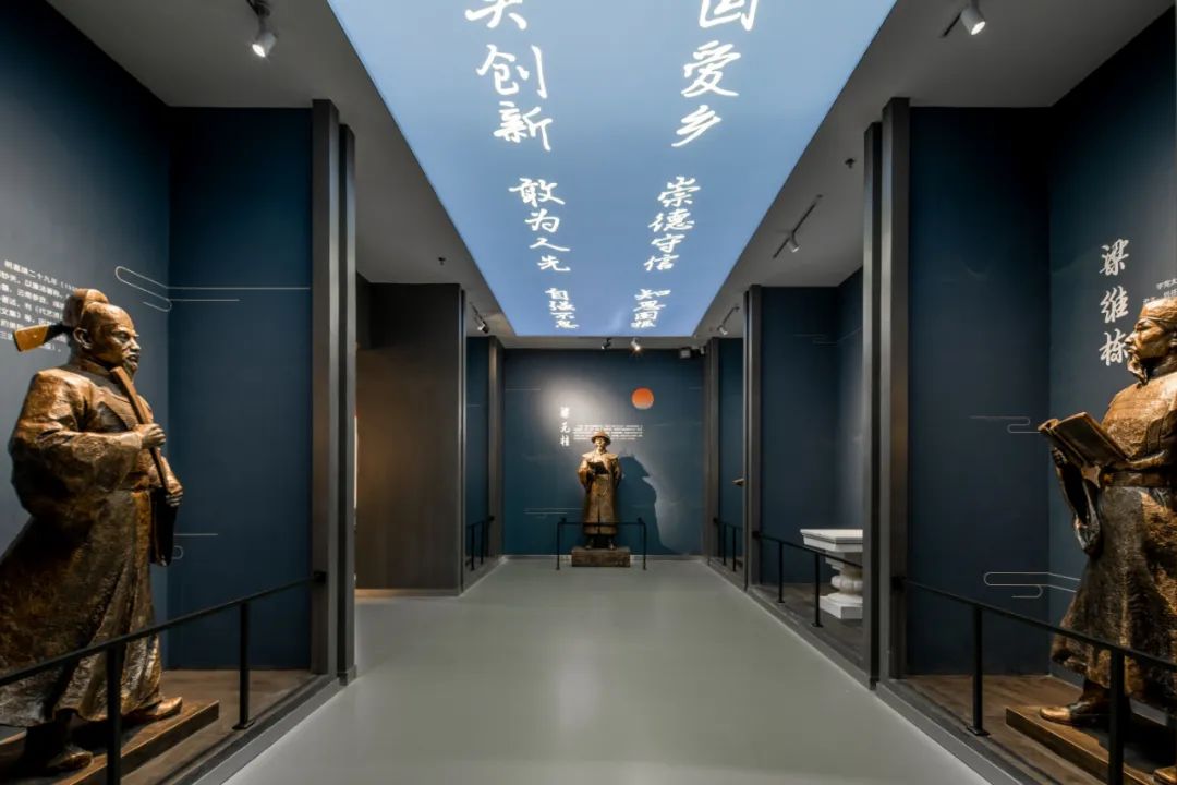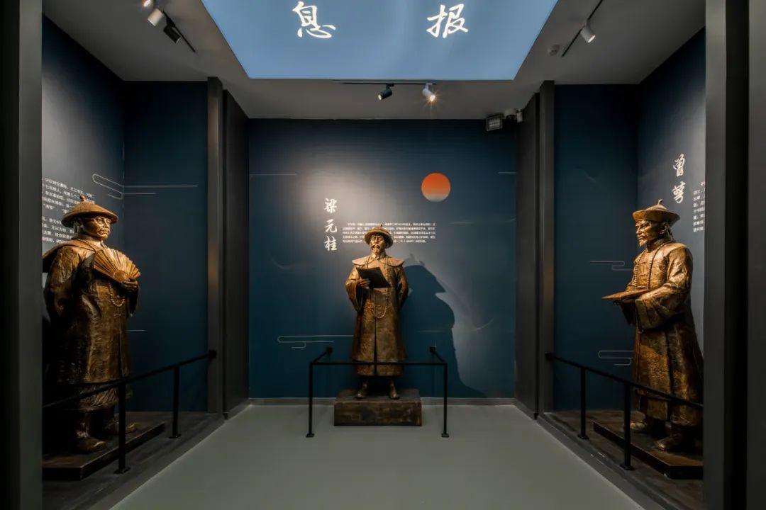 該展區(qū)主要陳列展示恩平教育發(fā)展歷史成果以及古代的官吏名人。步入文教興盛單元,歷史遺存的匾額赫然入目,兩根筆筒形狀的立柱鐫刻歇馬村祖訓(xùn),兩側(cè)圖文展板結(jié)合書(shū)院牌匾和歷史文物,展示古代恩平的著名書(shū)院,以及對(duì)文教興盛和文化傳承的高度重視。弧形中心設(shè)置歇馬村標(biāo)志性旗桿,上方設(shè)計(jì)多媒體顯示屏,循環(huán)播放歇馬村八大旗桿內(nèi)容,頂端設(shè)計(jì)玉斗,寓意才高八斗。旗桿后方懸掛孔子畫(huà)像,背景設(shè)計(jì)為弧形書(shū)架,寓意歇馬村崇文重教的風(fēng)尚。書(shū)架上方的弧形墻面,設(shè)計(jì)古代科舉過(guò)程,采用環(huán)形畫(huà)的方式,再現(xiàn)古代學(xué)子登科的過(guò)程,使參觀者了解古代考取功名的艱辛歷程。歷史先賢部分,以獨(dú)立空間展示恩平先賢,中間設(shè)計(jì)梁元桂雕像,兩側(cè)采用圖文、人物造型等手段,展示其生平介紹等內(nèi)容,頂部采用歇馬村勵(lì)學(xué)制為原型進(jìn)行藝術(shù)設(shè)計(jì),再現(xiàn)先賢生平,與整個(gè)展區(qū)相互呼應(yīng)。