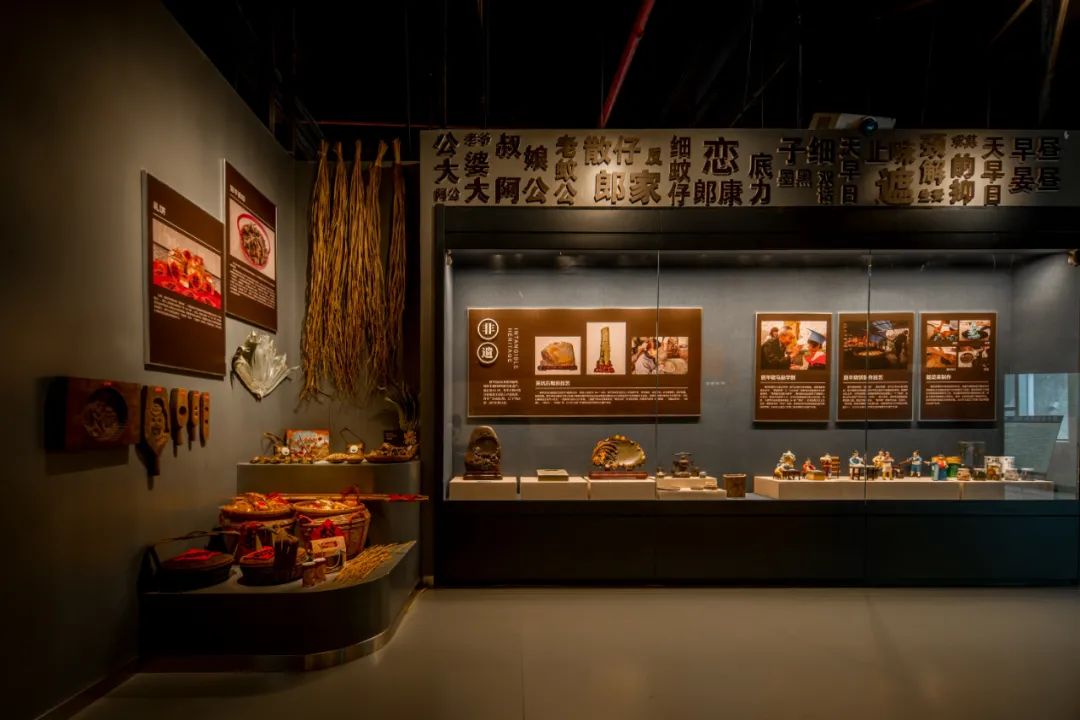 進(jìn)入本展區(qū),首先看到的是傳統(tǒng)文化節(jié)日展,通過(guò)圖文展板與實(shí)物陳列等手法,展示攔火社、中秋節(jié)、端午節(jié)等節(jié)日活動(dòng)內(nèi)容。婚嫁單元,采用場(chǎng)景還原的手法,結(jié)合智能調(diào)光玻璃系統(tǒng),展示恩平傳統(tǒng)風(fēng)俗,觸發(fā)感應(yīng)區(qū)透明玻璃變?yōu)轱@示系統(tǒng),參觀者可欣賞恩平婚禮過(guò)程。非遺單元采用通壁展柜結(jié)合圖文展板展示省級(jí)非遺,上方設(shè)計(jì)恩平稱謂用語(yǔ),同時(shí)在此處設(shè)置互動(dòng)點(diǎn)播系統(tǒng),“跟我學(xué)唱恩平民歌”和“跟我學(xué)說(shuō)恩平話”,在互動(dòng)中尋找樂(lè)趣。
