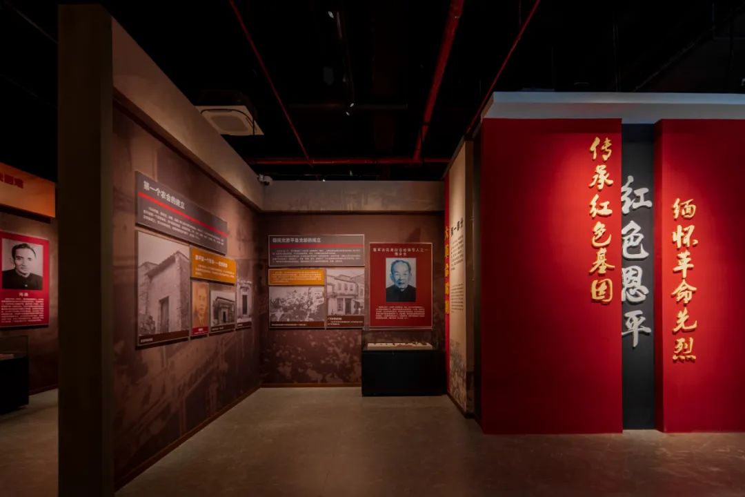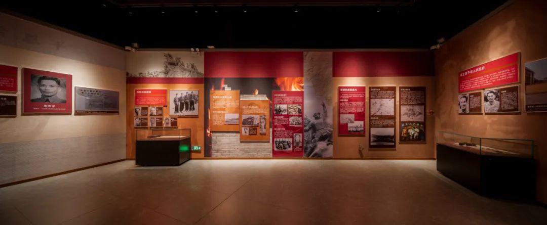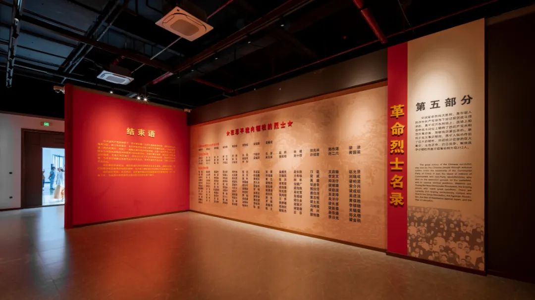 展區(qū)以黃色為主色調(diào),弧形墻壁并篆刻烈士名錄,象征著烈士們忠心向黨的紅心,設(shè)計(jì)莊重肅穆。