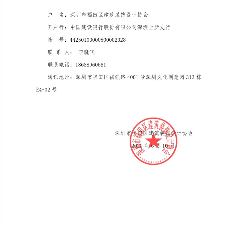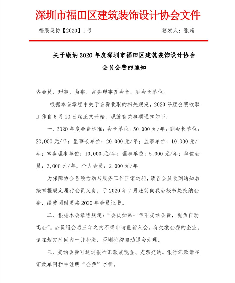 關于繳納2020年度深圳市福田區(qū)建筑裝飾設計協(xié)會會員會費的通知