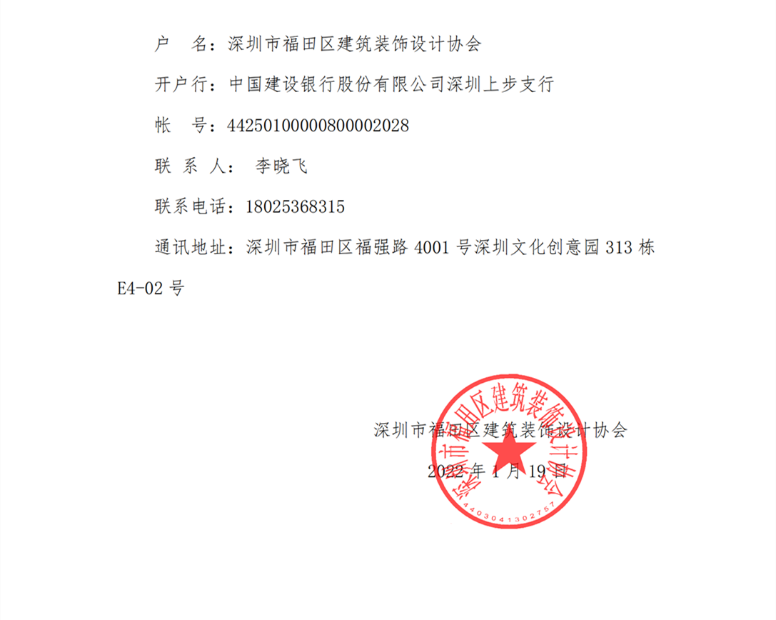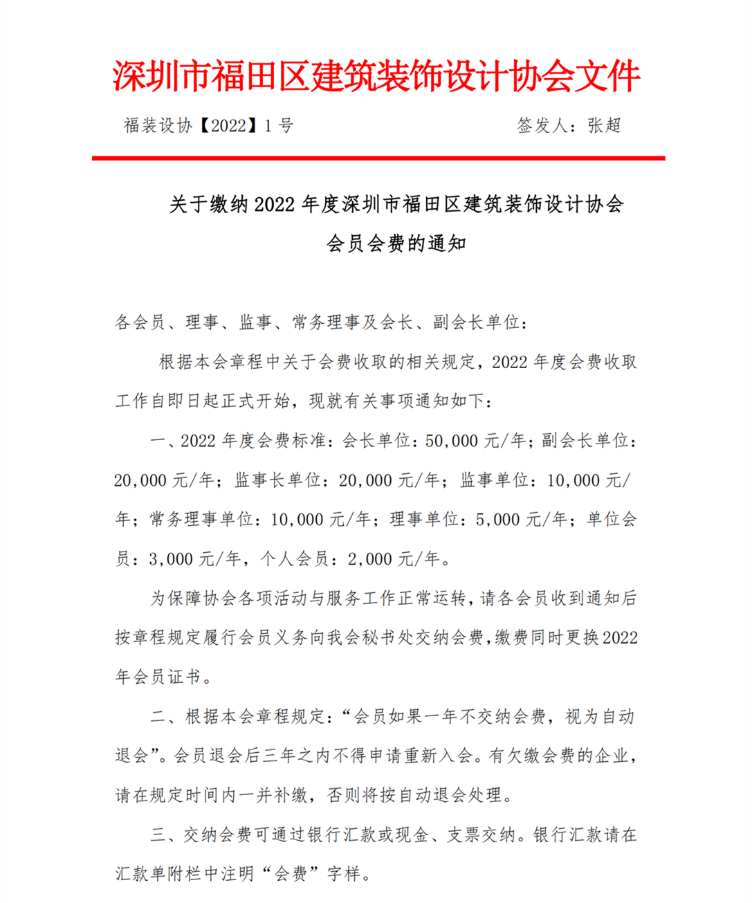 關于繳納2022年度深圳市福田區建筑裝飾設計協會會員會費的通知