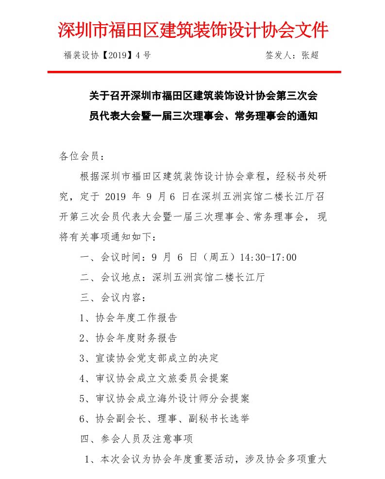 關(guān)于召開深圳市福田區(qū)建筑裝飾設(shè)計(jì)協(xié)會第三次會員代表大會暨一屆三次理事會、常務(wù)理事會的通知