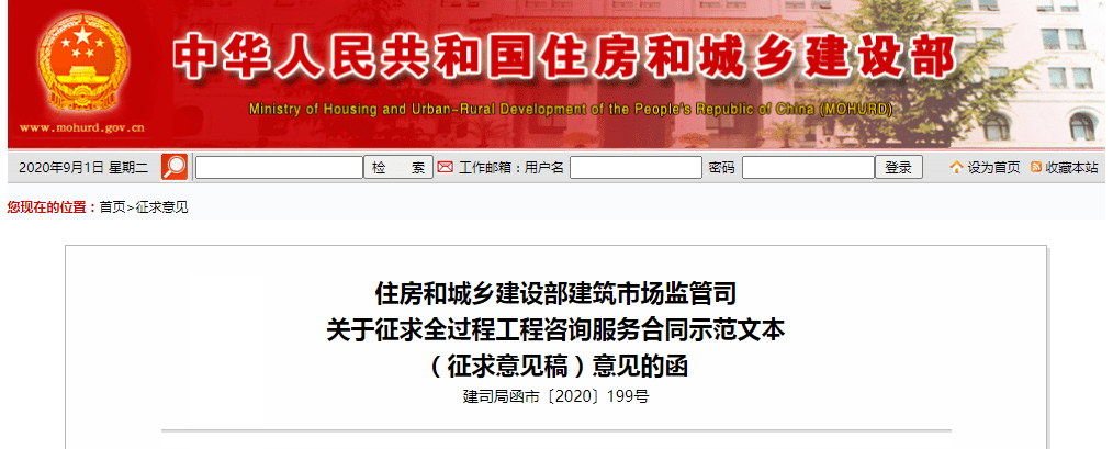 為加快推進全過程工程咨詢服務發展,完善配套制度,8月31日,住房和城鄉建設部建筑市場監管司關于征求全過程工程咨詢服務合同示范文本(征求意見稿)意見的函。