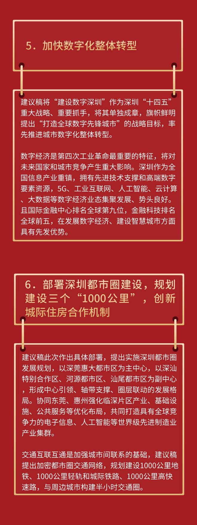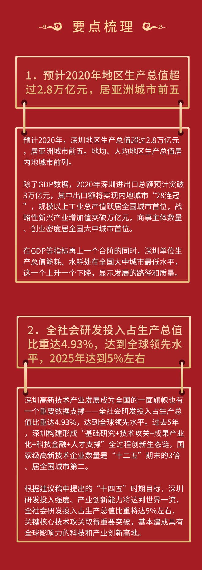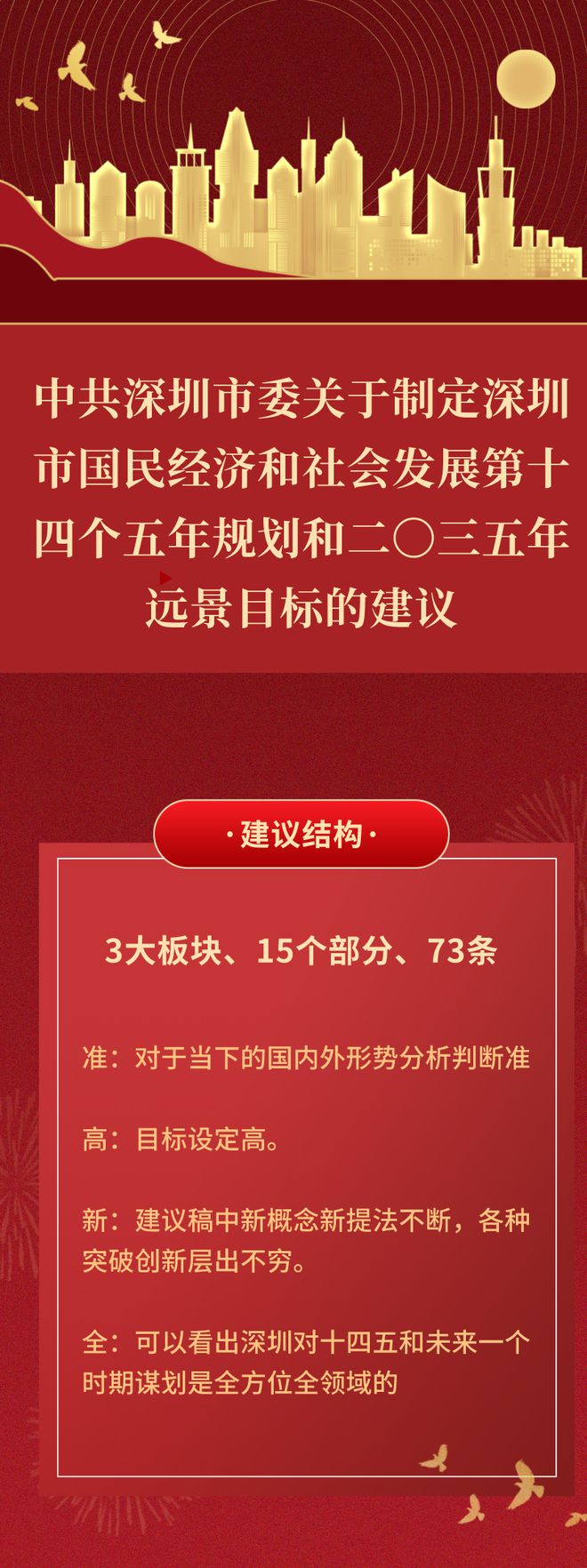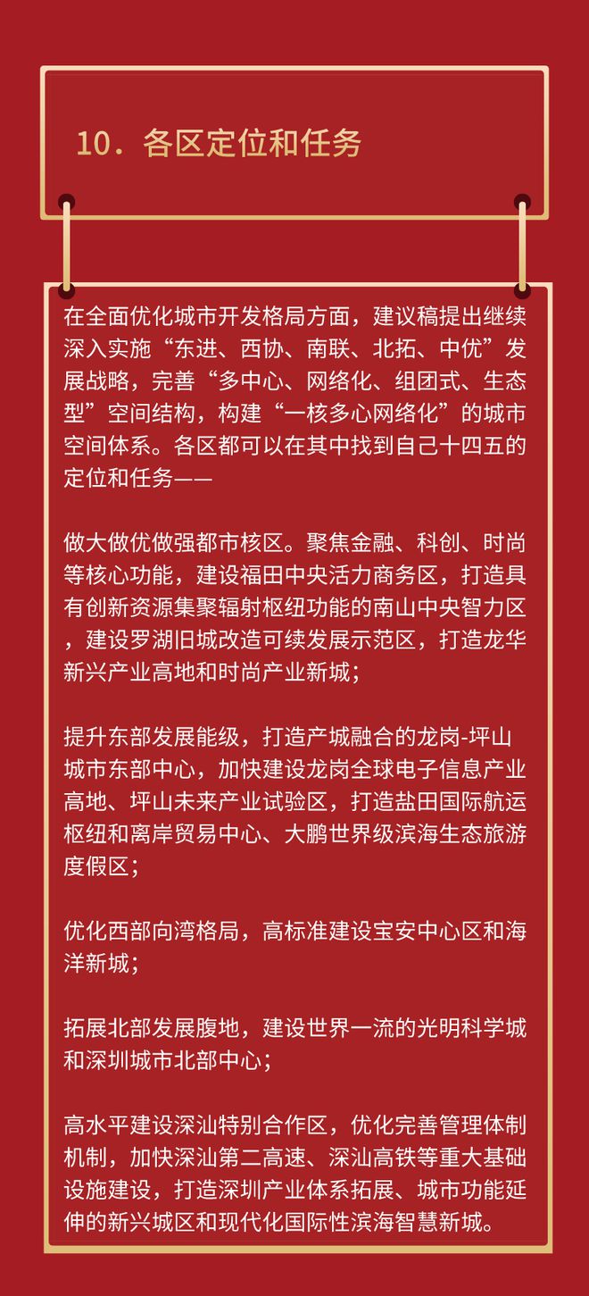 近日,《中共深圳市委關(guān)于制定深圳市國民經(jīng)濟和社會發(fā)展第十四個五年規(guī)劃和二〇三五年遠景目標的建議》(以下簡稱“建議稿”)正式出爐,建議稿在結(jié)構(gòu)上分3大板塊,共15個部分、73條,約2.7萬字,詳細闡述了深圳今后5年、10年乃至15年的經(jīng)濟社會發(fā)展,信息量極大。