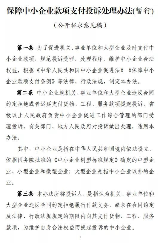 為進一步貫徹落實《中小企業促進法》和《保障中小企業款項支付條例》要求,切實保障中小企業合法權益,工業和信息化部中小企業局組織起草《保障中小企業款項支付投訴處理辦法(暫行)》(征求意見稿),公開征求社會各界意見,意見征求截止日期為2021年10月5日。