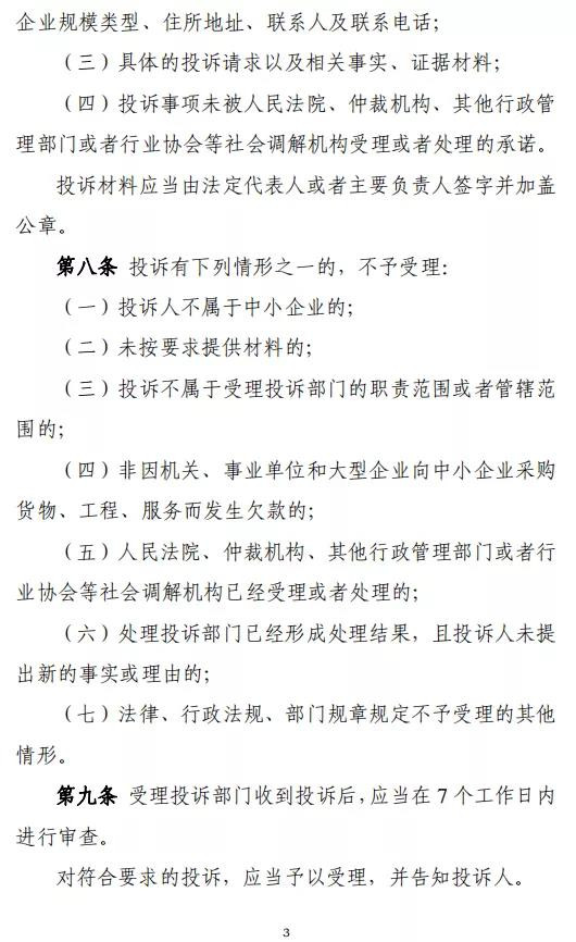 中小企業就機關、事業單位和大型企業違反合同約定拒絕或者遲延支付貨物、工程、服務款項提起投訴,省級以上人民政府負責中小企業促進工作綜合管理的部門受理投訴,有關部門、地方人民政府對投訴做出處理,適用本辦法。