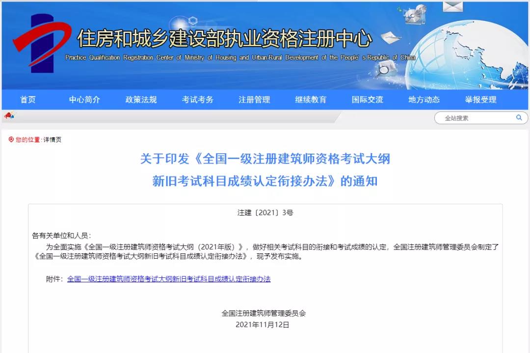 11月12日,全國注冊建筑師管理委員會發(fā)布了《全國一級注冊建筑師資格考試大綱(2021年版)》公告和《全國一級注冊建筑師資格考試大綱新舊考試科目成績認(rèn)定銜接辦法》通知。其中: