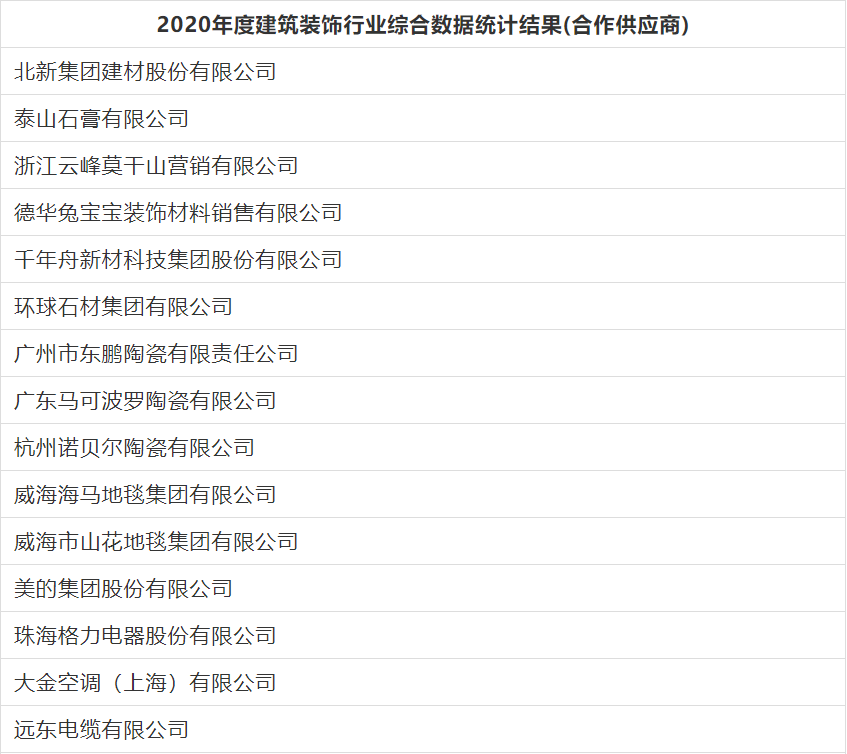 根據《關于開展2020年度建筑裝飾行業綜合數據統計工作的通知》(中裝協 [2021]35號)及文件中所確定的工作原則和統計規則, 現已完成對各企業填報的指標數據和相關材料的綜合統計。