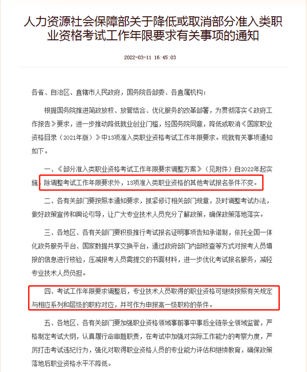 根據(jù)國(guó)務(wù)院推進(jìn)簡(jiǎn)政放權(quán)、放管結(jié)合、優(yōu)化服務(wù)的改革部署,為貫徹落實(shí)《政府工作報(bào)告》要求,進(jìn)一步推動(dòng)降低就業(yè)創(chuàng)業(yè)門檻,經(jīng)國(guó)務(wù)院同意,降低或取消《國(guó)家職業(yè)資格目錄(2021年版)》中13項(xiàng)準(zhǔn)入類職業(yè)資格考試工作年限要求。現(xiàn)就有關(guān)事項(xiàng)通知如下。