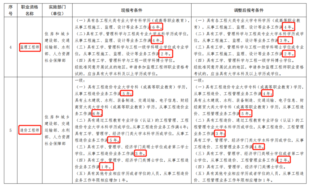 3月11日,中國(guó)人事考試網(wǎng)發(fā)布了《人力資源社會(huì)保障部關(guān)于降低或取消部分準(zhǔn)入類職業(yè)資格考試工作年限要求有關(guān)事項(xiàng)的通知》,通知中提到降低或取消《國(guó)家職業(yè)資格目錄(2021年版)》中13項(xiàng)準(zhǔn)入類職業(yè)資格考試工作年限要求。其中包括建造師(一級(jí))、造價(jià)工程師、監(jiān)理工程師、注冊(cè)安全工程師(中級(jí))等。