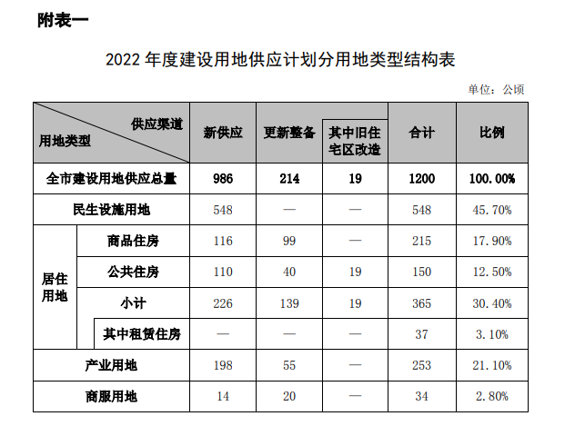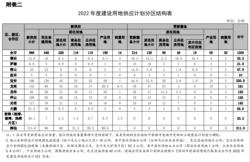 根據(jù)計(jì)劃,2022年度全市(含深汕,下同)計(jì)劃供應(yīng)建設(shè)用地1200公頃(詳見附表 1、2),其中新供應(yīng)建設(shè)用地986公頃,更新整備供應(yīng)建設(shè)用地214公頃(含舊住宅區(qū)改造供應(yīng)居住用地19公頃)。具體來看,民生設(shè)施用地 548公頃,居住用地365公頃,產(chǎn)業(yè)用地253公頃,商服用地34公頃。