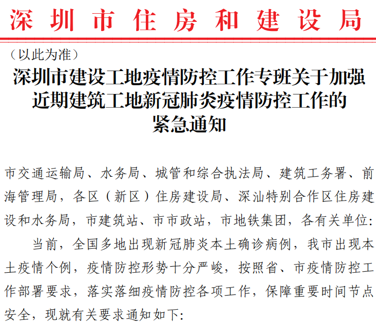 近日,深圳市建設(shè)工地疫情防控工作專班發(fā)布了關(guān)于加強(qiáng)近期建筑工地新冠肺炎疫情防控工作的緊急通知。
