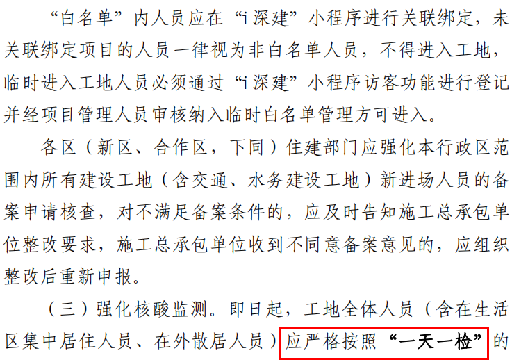 5、即日起,工地全體人員(含在生活區(qū)集中居住人員、在外散居人員應(yīng)嚴(yán)格按照“一天一檢”的要求參加核酸檢測(cè),確保“不漏一人”。