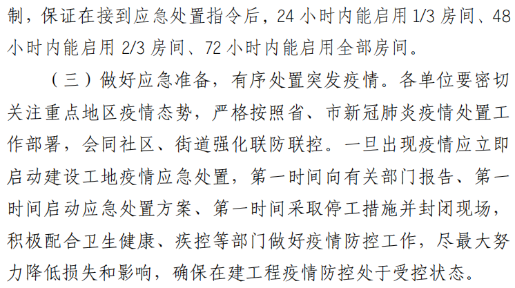 6、一旦出現(xiàn)疫情應(yīng)立即啟動(dòng)建設(shè)工地疫情應(yīng)急處置,第一時(shí)間向有關(guān)部門(mén)報(bào)告、第一時(shí)間啟動(dòng)應(yīng)急處置方案、第一時(shí)間采取停工措施并封閉現(xiàn)場(chǎng)。