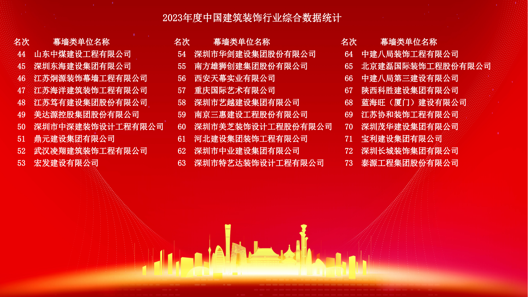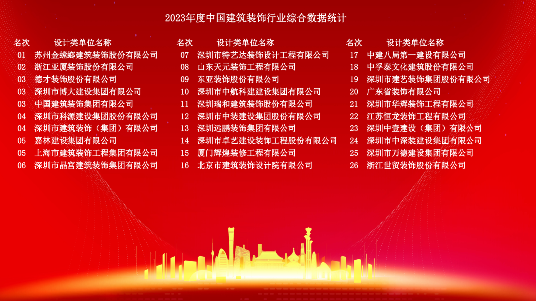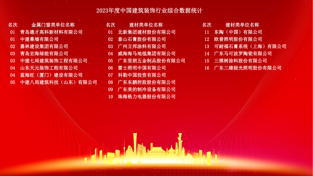 12月10日,2023年度中國建筑裝飾協會行業綜合數據統計正式發布。詳細名單如下: