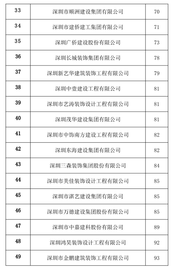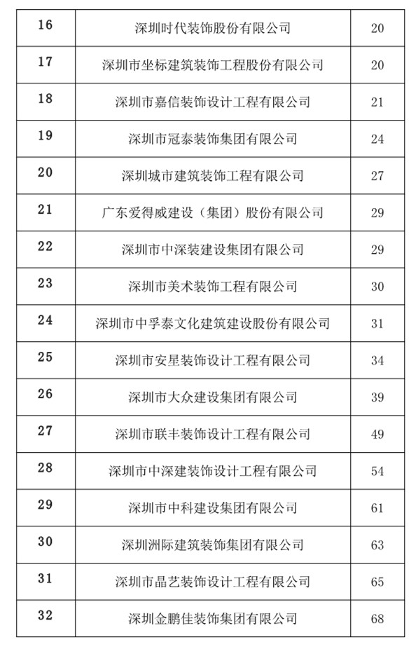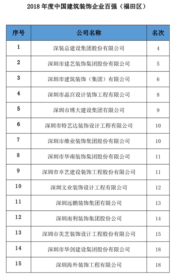 11月24日,中國建筑裝飾協會正式公布了2018年度中國建筑裝飾行業綜合數據統計排名。在統計結果(裝飾類)名單中,深圳共67家建筑裝飾設計企業入選,其中50家為福田建筑裝飾設計企業,占比2/3。